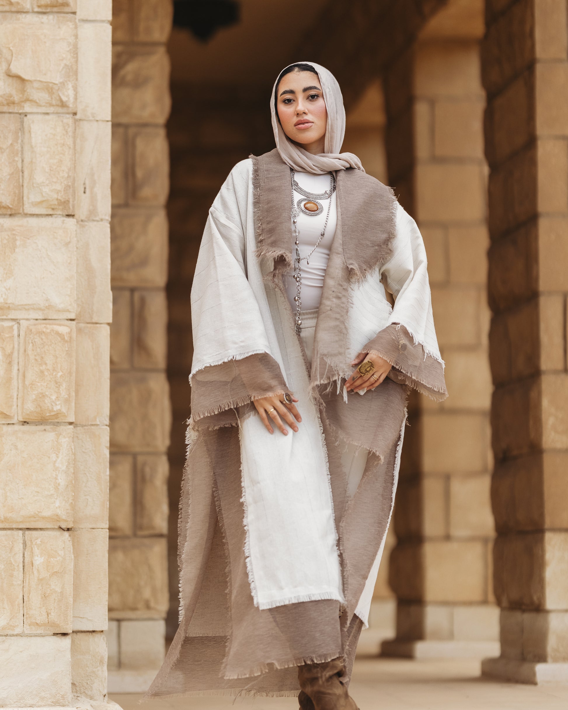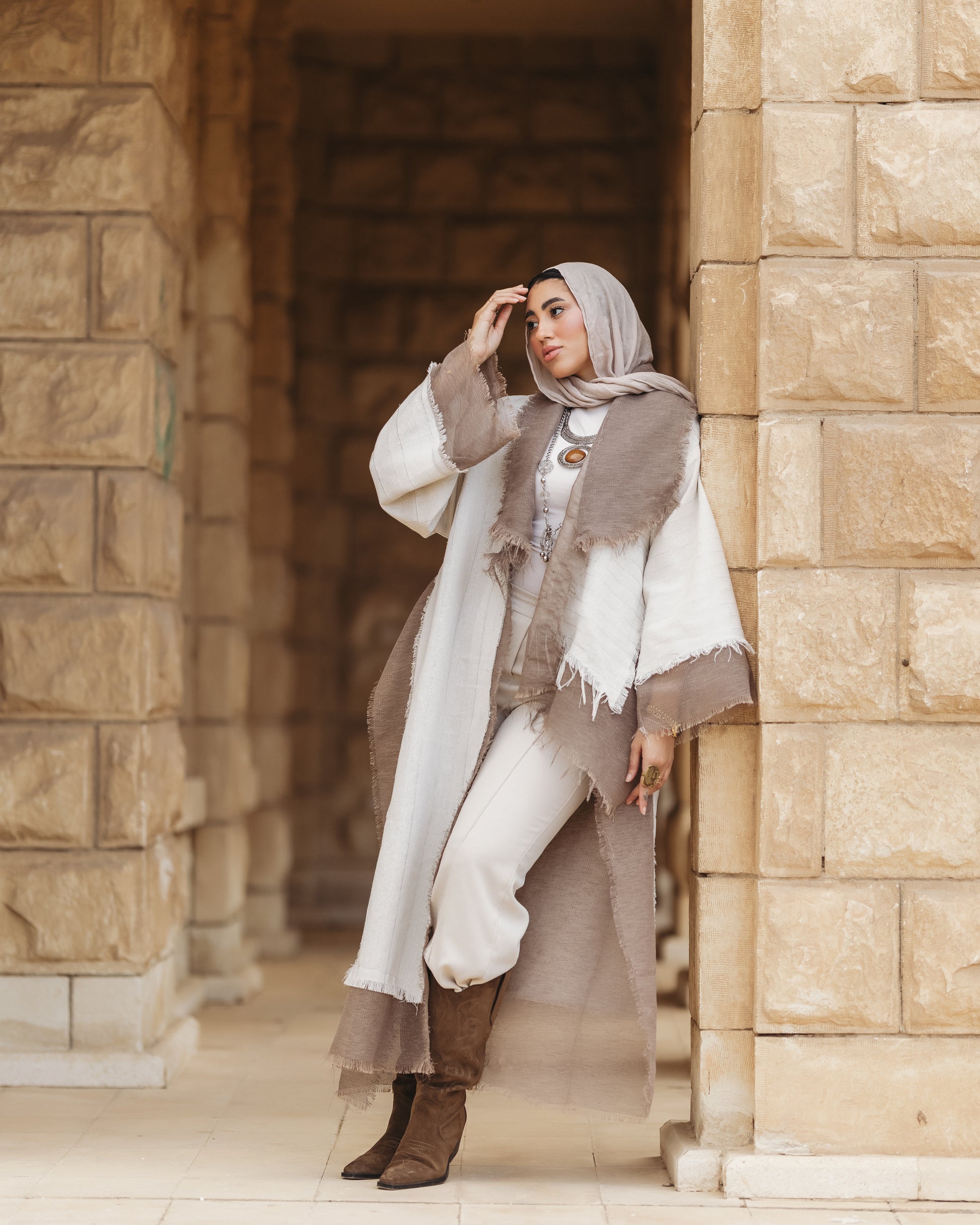 الخامة: مزيج من الكتان المصنع الفضي ممزوج بكتان خيش بني فاتح