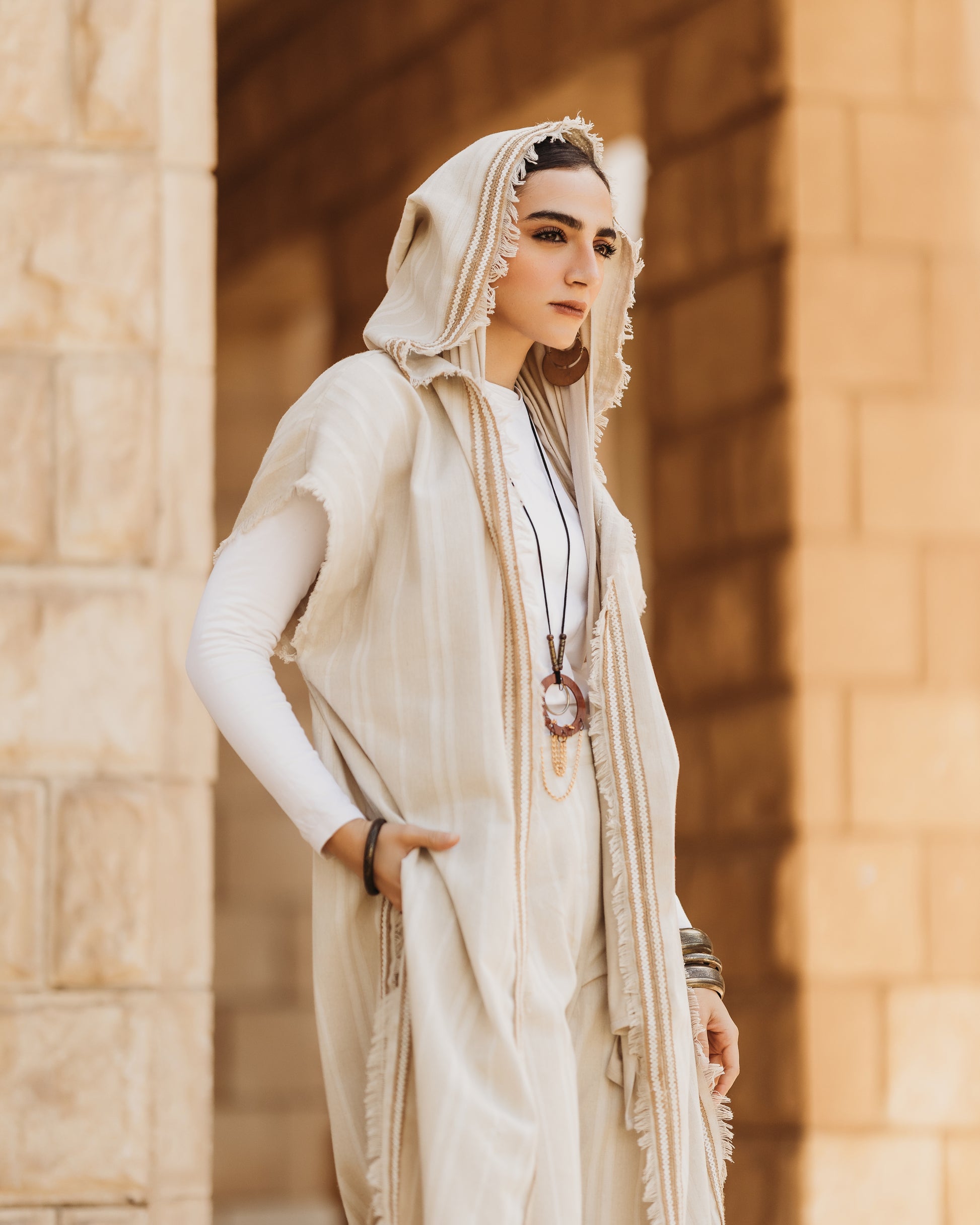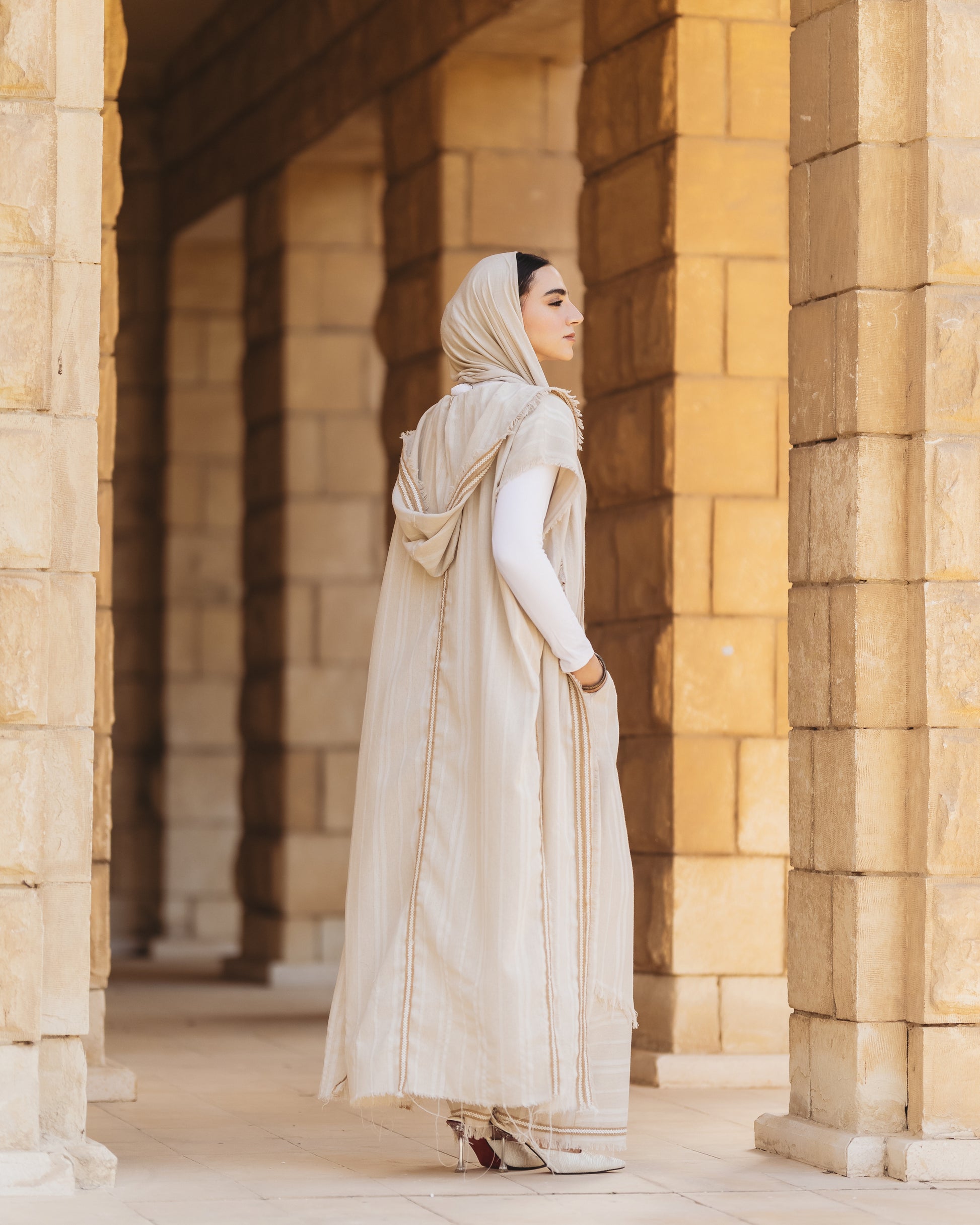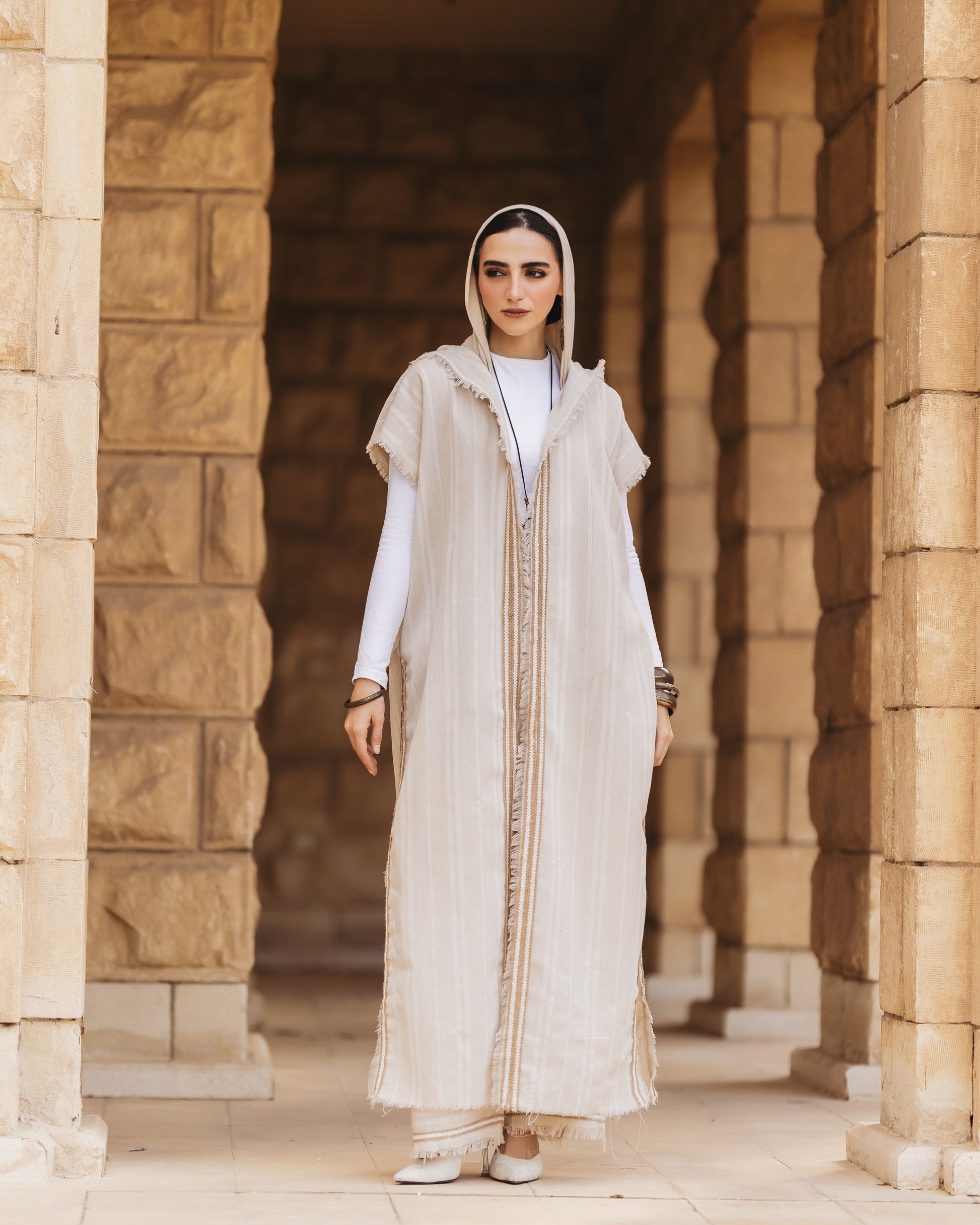 اللون: بيج فاتح مقلم مطعم بكلفة خيش جملي